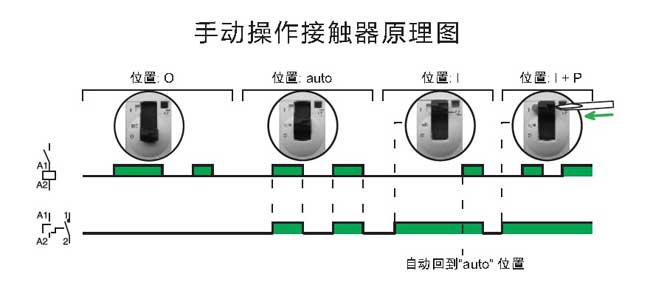 ·手動(dòng)操控的接觸器在其前端面有4個(gè)位置選擇開(kāi)關(guān):自動(dòng)操作模式;臨時(shí)“開(kāi)”;永久“開(kāi)”: 用于鎖定安裝維護(hù)過(guò)程中處于“開(kāi)”位置的接觸器;關(guān)斷狀態(tài)